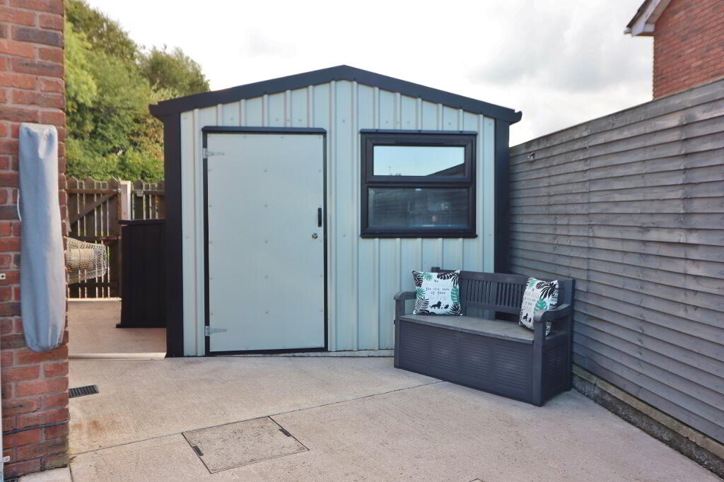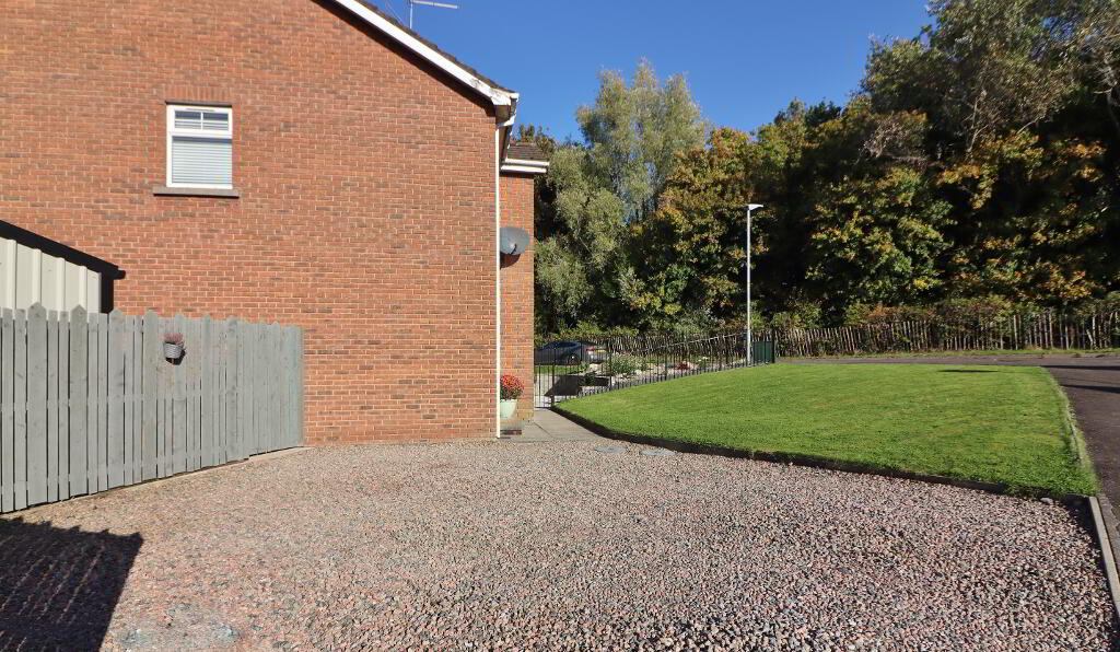 OUTSIDE: Open front garden laid in lawn with driveway laid in pebble stones. Spacious enclosed back garden paid laid in astro artificial grass lawn, part laid in concrete and enclosed storage area for oil tank and bins.