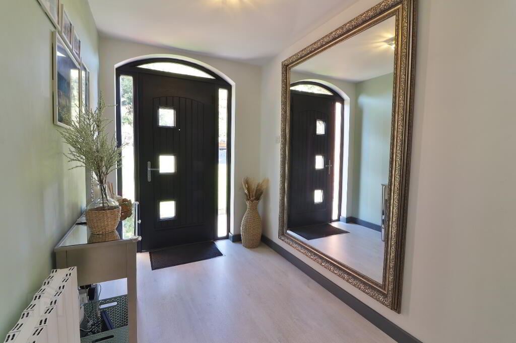 ENTRANCE HALL: Composite front door with small glass insets and side glass panels, built in cloakroom, laminate wooden flooring, double panel radiator, power points.