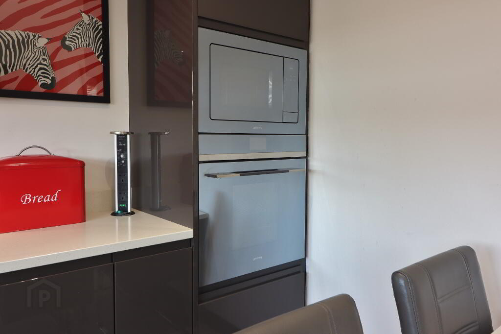 KITCHEN/DINETTE: 12’06” x 11’03”. Contemporary fitted kitchen with low & high level units and under lighting, Quartz worktops and Quartz splashback, undermount sink unit with mixer taps and drainer, built in Smeg hob with Elica extractor fan, built in Smeg oven & microwave, integrated fridge/freezer, recess spotlighting, laminate wooden flooring, white vertical panel radiator, power points.