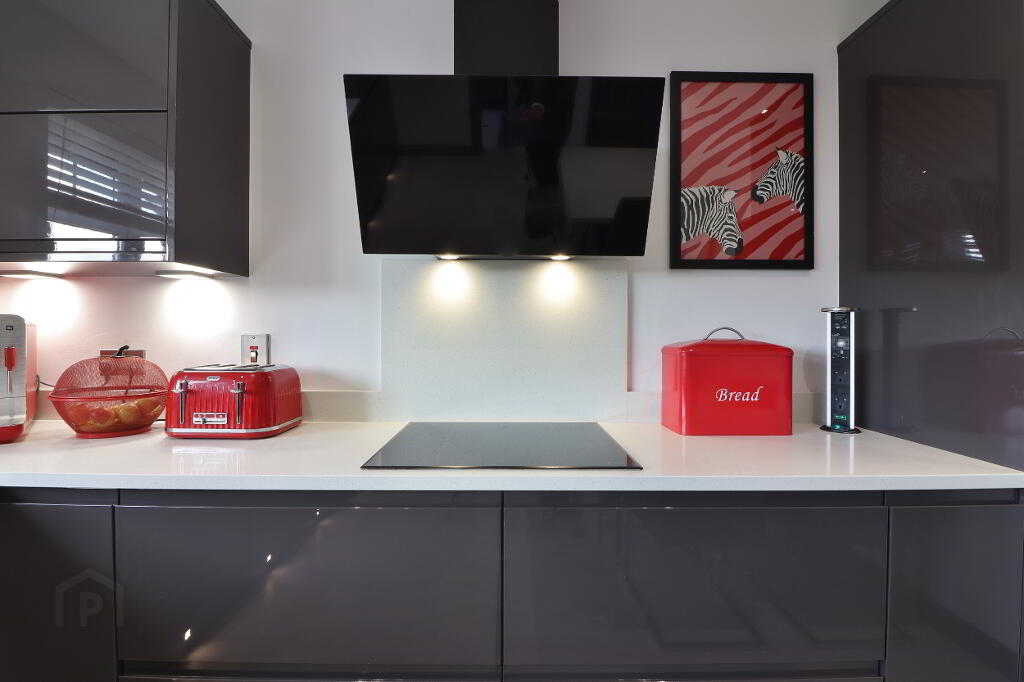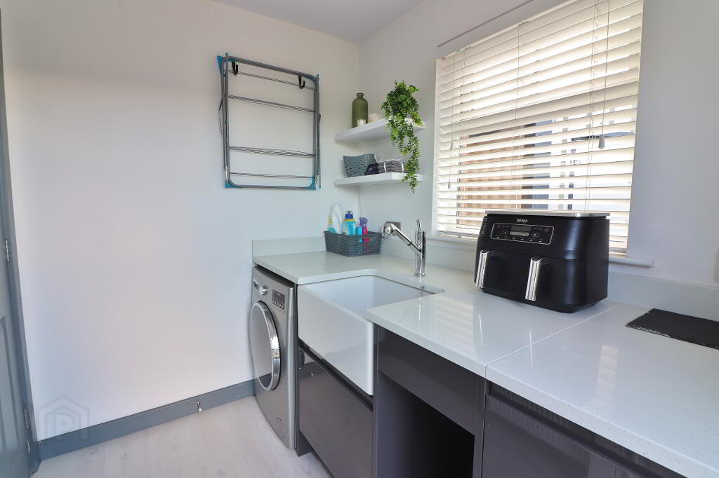UTILITY ROOM: Contemporary fitted low level units with Belfast sink, Quartz worktop and Quartz splashback, laminate wooden flooring, plumbed for washing machine, double panel radiator, power points.