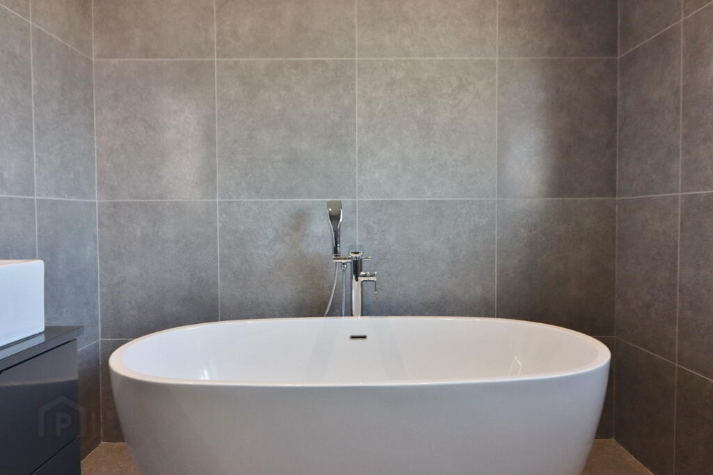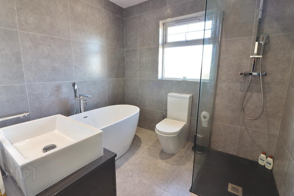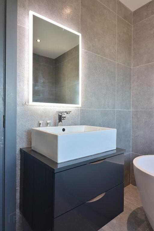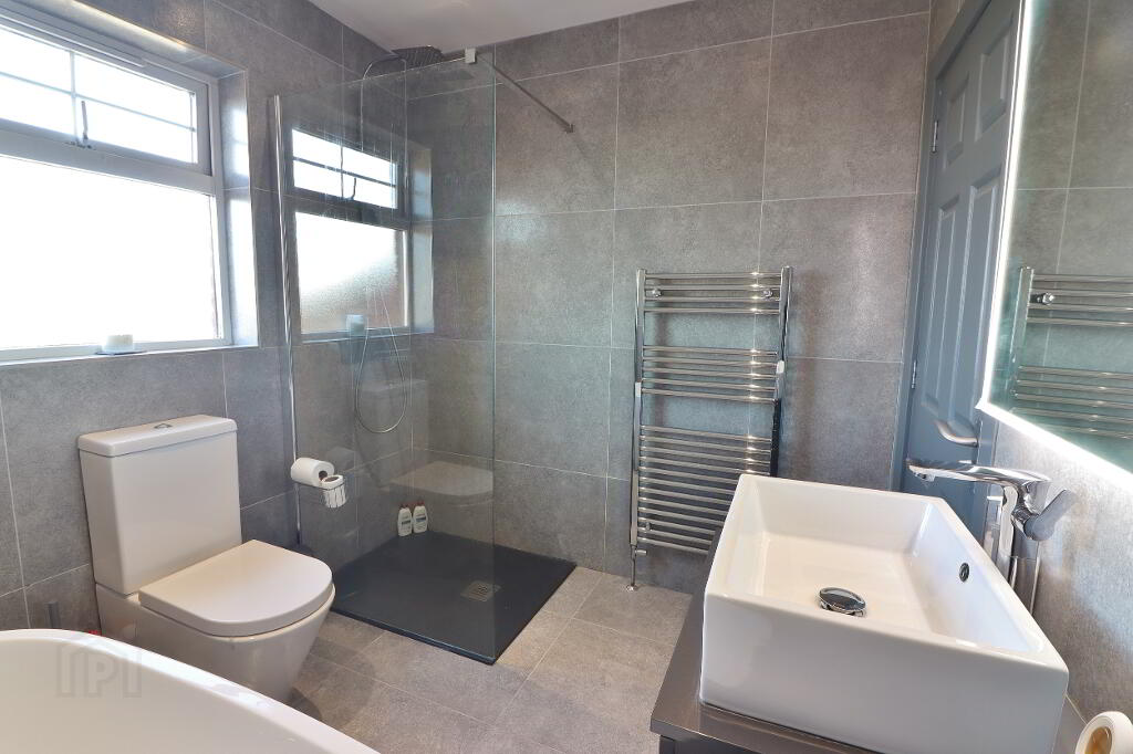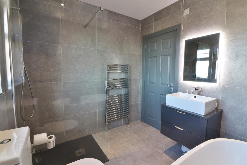 BATHROOM: Luxury white 3 piece suite comprising free standing bath, vanity unit and low flush wc, step in power shower cubicle with waterfall showerhead and grey slate tray, recess spotlighting, tiled walls throughout, tiled flooring, chrome towel radiator.