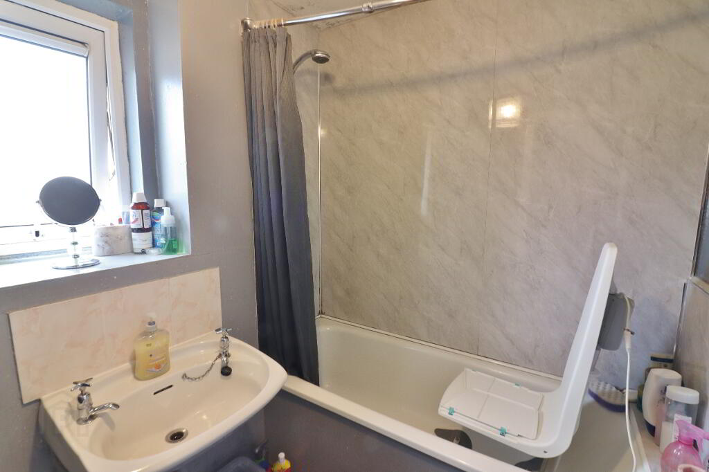 BATHROOM: White 2 piece suite comprising bath and wash hand basin, wall mounted shower over bath, part Pvc panelled walls, single panel radiator.