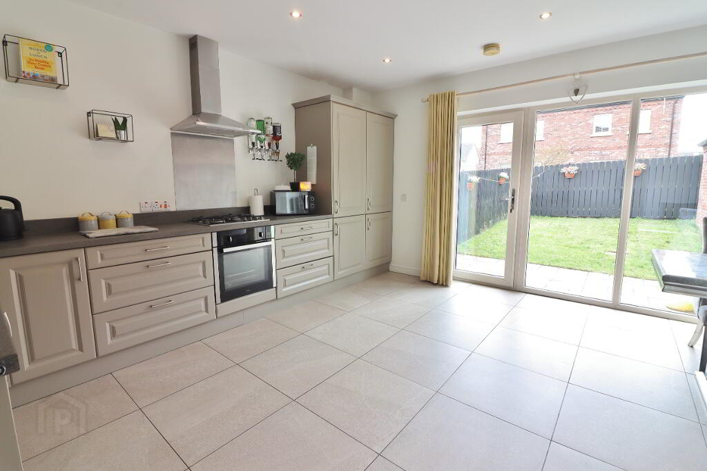 KITCHEN/DINING AREA: 14’08” x 11’01”. Alcove 7’0” x 5’01”. Fitted kitchen with low and high level units, stainless steel extractor fan, built in oven/gas hob with stainless steel back splash. 1 ½ bowl stainless steel sink unit with mixer taps and drainer, integrated fridge/freezer, integrated dishwasher, recess spotlighting, quarry tiled flooring, double panel radiator, power points, glass panelled Pvc patio door with side glass panels leading to rear.