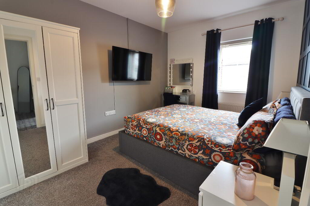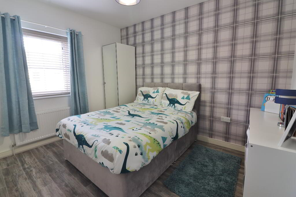 MASTER BEDROOM: 13’02” x 9’06”. Part panelled wall feature, double panel radiator, power points, aerial point.